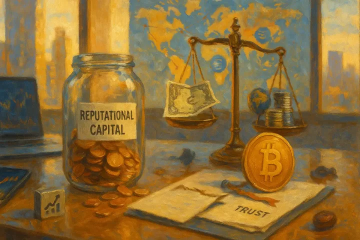 Building reputational capital works like adding pennies to a jar – each good deed incrementally adds to your standing. Yet reputational capital can collapse instantly by removing the jar’s bottom. A single breach of trust doesn’t just remove one penny; it can wipe out your entire balance and plunge you into reputational bankruptcy. The math is brutally asymmetric: good deeds might add a point or two, while bad deeds subtract by factors of 50 or 100.
